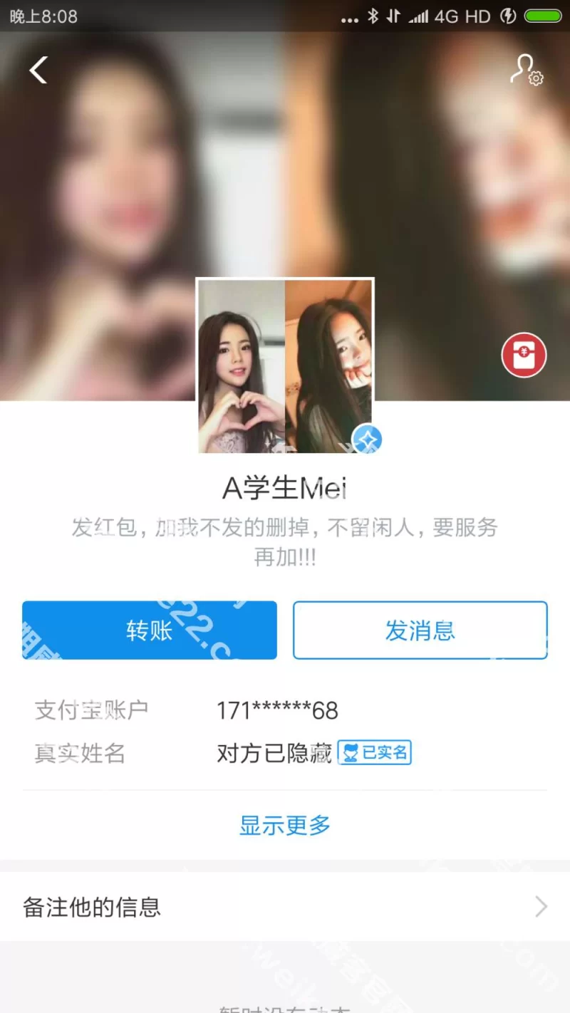 综合评价:说有各种女大学生资源先让你选要99的还是198的然后开始要钱支付宝转微信转付完钱之后还要再转200保证金保证不拍摄不给然后就把我删除了
