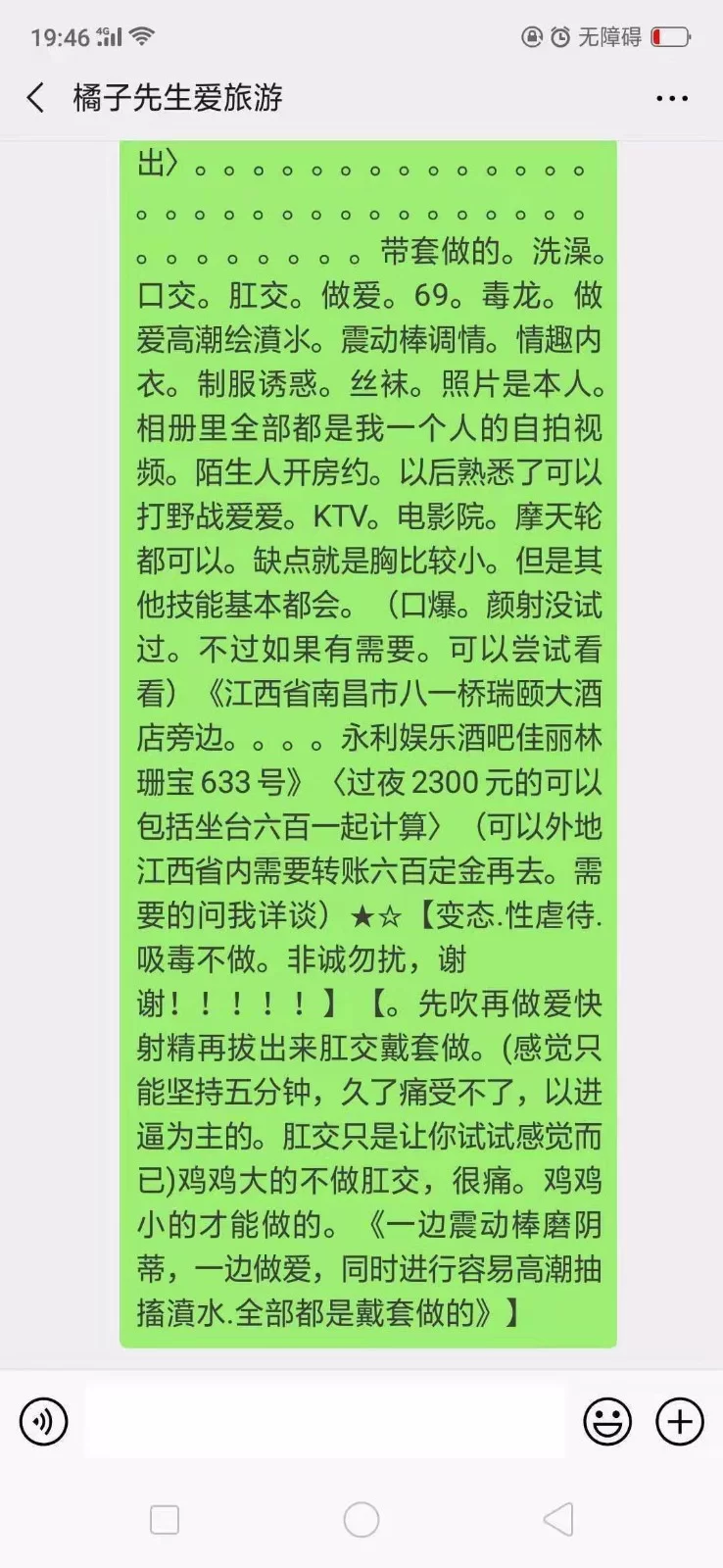 信息分类:楼凤兼职 地区:江西省-南昌 信息来源:论坛 小姐数量:1 小姐年龄:20-30 小姐素质:高 小姐外形:80 服务项目:自己可选 营业时间:全天 环境设备:开始酒店,熟了随意 安全评估:安全 详细地址:本段信息已隐藏,请先登陆。点击登陆 , 或者 点击注册 联系方式:本段信息已隐藏,请先登陆。点击登陆 , 或者 点击注册 综合评价:贵 详细介绍: 黄文不会写,项目很多,专业干这个的,就是有点贵,大家自己体会吧 楼凤兼职