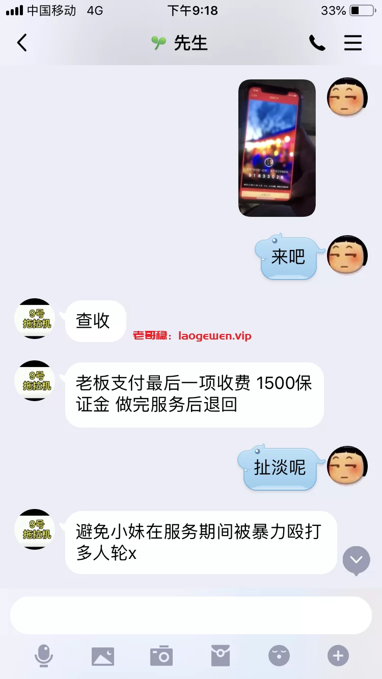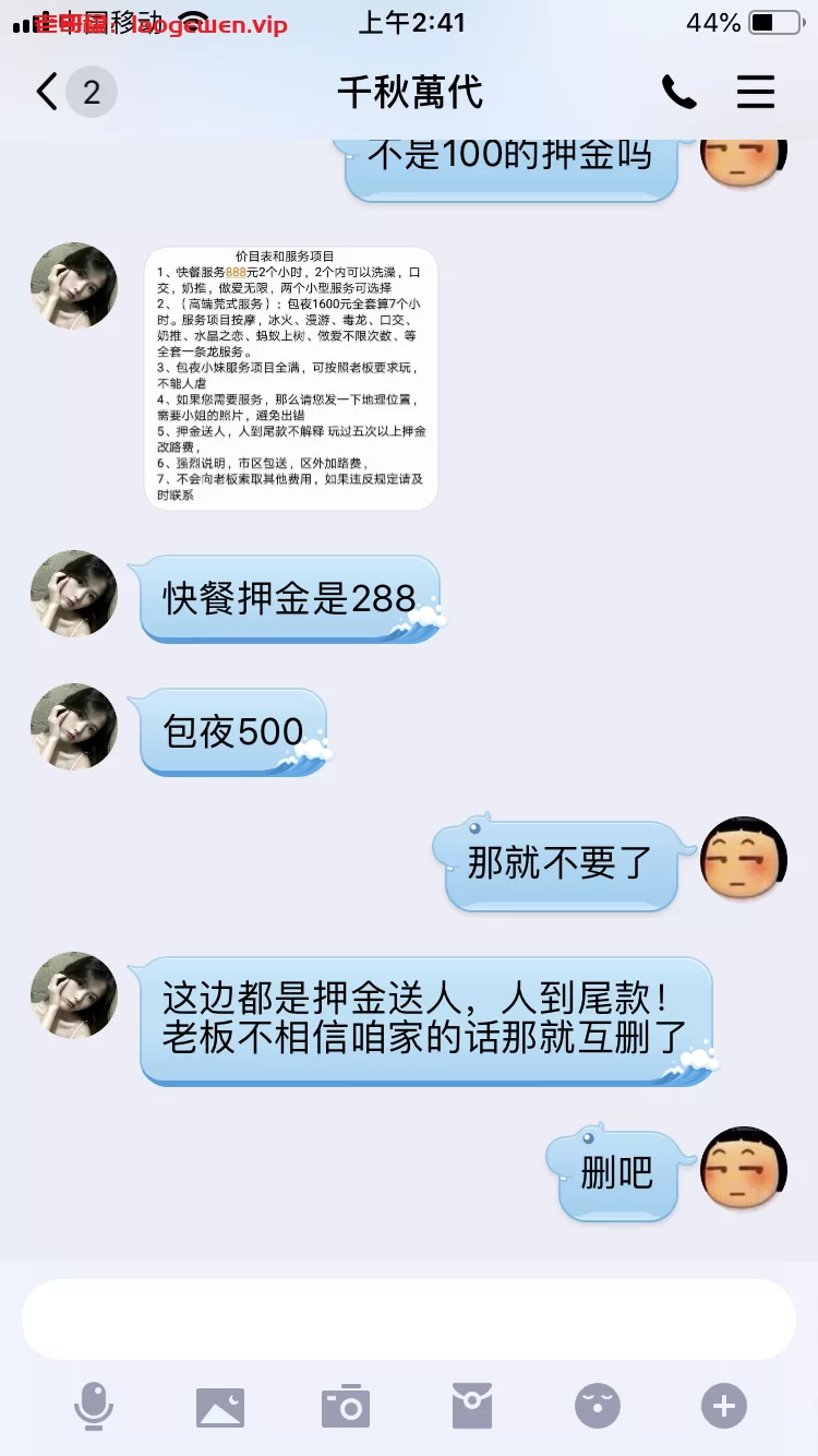 首先,事情起因是朋友要到宿迁来玩,让我找找资源,我从宿迁贴吧里翻到俩个号称玩过有资源的“老司机”,通过私信加上Q(QQ1714432092/QQ2232212641),然后各发了个烟钱求分享联系,各推送后QQ(QQ2020253640/QQ3173506500)加上,联系第一个从报价到选人都没有问题,最后说要给押金我果断拒绝拉黑,可是朋友不死心,不相信我,我就配合他让他买个教育…联系第二个人,报价选人也是没有问题,同样的最后要押金,朋友选择快餐押金288,人到付剩余,毫无破绽,20分钟后说人到楼下,要付尾款,朋友傻兮兮的付了尾款,然后对方又要求付1500保证金,朋友才意识到被骗,才放弃。(以此列警各狼友押金都是骗子)