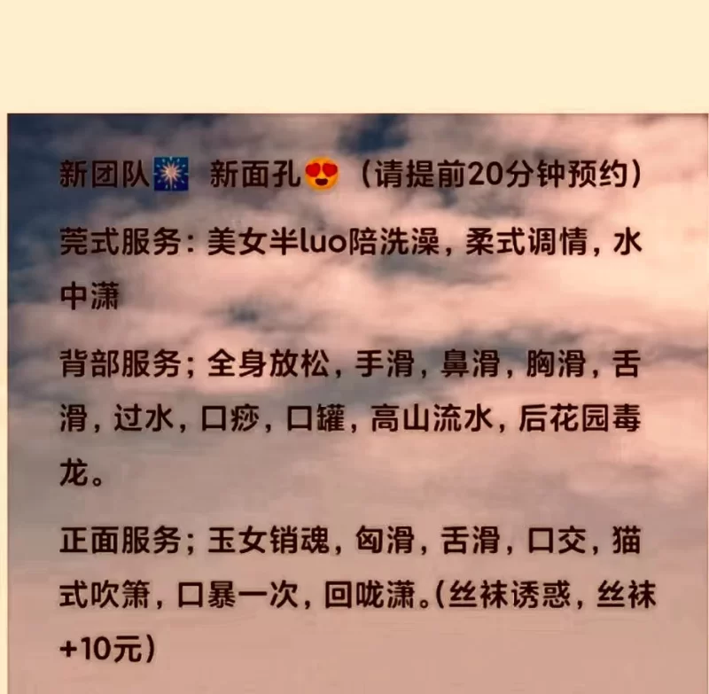 XL 作为一个本地人,一个服务控,在晚上闲着没事打开附近人选出来的,特意去探一下,之前在遵义探了好多店,让 XL 都不是很满意,直到探到这家店,让 XL 比较满意,服务也是目前在遵义探店中最好的,特推荐一下。进门有人接待安排好房间和技师,技师不满意可以换,换到满意为止(店里有十多个技师),xl 本着个人探店的原则,直接轮排一个技师,相貌身材都不错,就先洗澡(洗澡的过程中技师透露出可以做全套,要不要做等),xl加钱选的是全套,然后开始做服务,服务内容很多,莞式,AB面,毒龙,指滑等,做完服务后 xl 再也忍受不了了,直接提枪上马,过程不表,懂得都懂,由于 xl 时间比较久,半小时后还没有射的欲望,刚好又到钟了,于是 xl 果断选择轮排换人体验一下半套,服务内容也是一样的,这就不说了,最后在技师的口中释放了出来。结束后休息会洗澡穿衣走人!总的来说这家店服务和技师的质量还是很不错的,推荐一下!