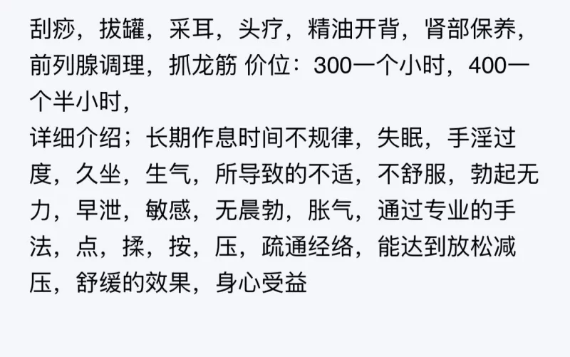 北京丰台拔龙筋 该文章被用户投诉为:联系方式失效,增加联系方式并审核通过后可自动删除投诉标记 [增加联系方式] 疑似失效 联系方式已被举报失效/虚假,请谨慎购买 2025-03-29 0 丰台 外围小姐