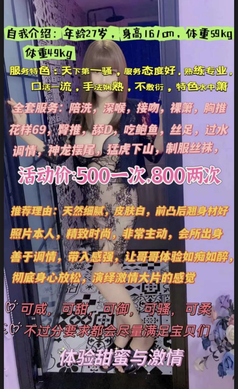 妹纸的服务真的是超给力的。她开始发功了,主动的跟我接吻,我操,这个真的是被爽到了,全身被电击,有点受不了。她很有性爱经验,各种挑逗,让你招架不住。 基本的服务都能做,尺度相当棒了。口活不叫停绝对的不停,下面完全就是小水b的节奏, 次次插到底,啪啪啪特过瘾,她还高潮了好几波,感觉身体都被这货给掏空了。